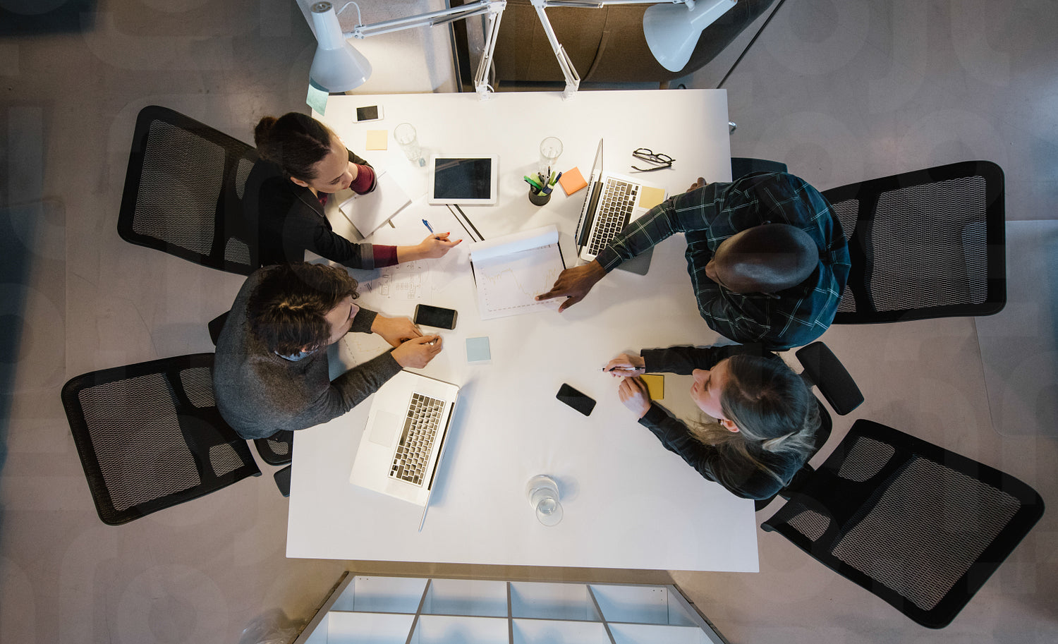 Overhead view of diverse team analyzing data while sitting at office. Multiracial business people in a meeting working on new project.