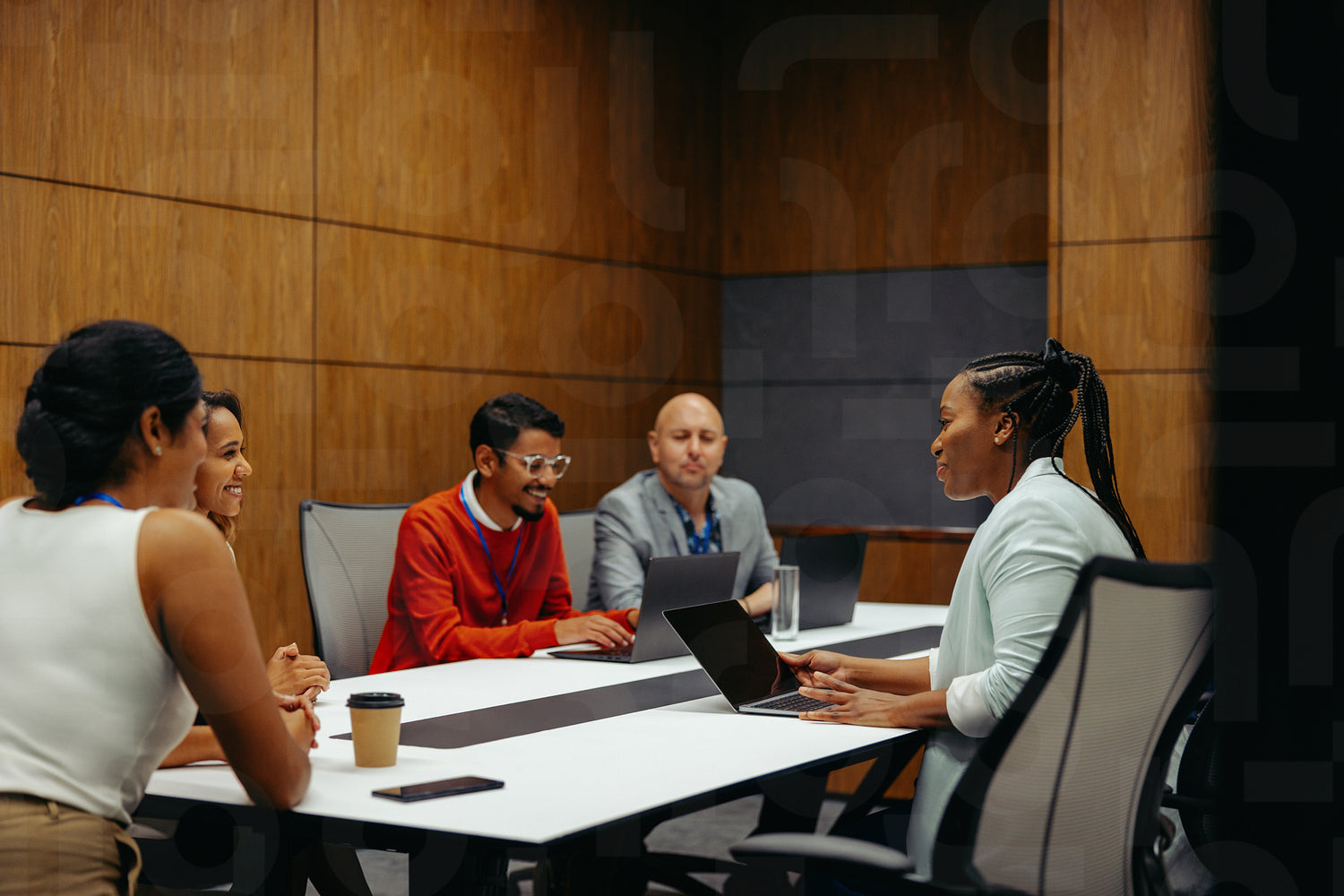 A corporate business meeting with a diverse team discussing ideas around a boardroom table. The group consists of five professionals engaged and collaborative, fostering a productive work environment.