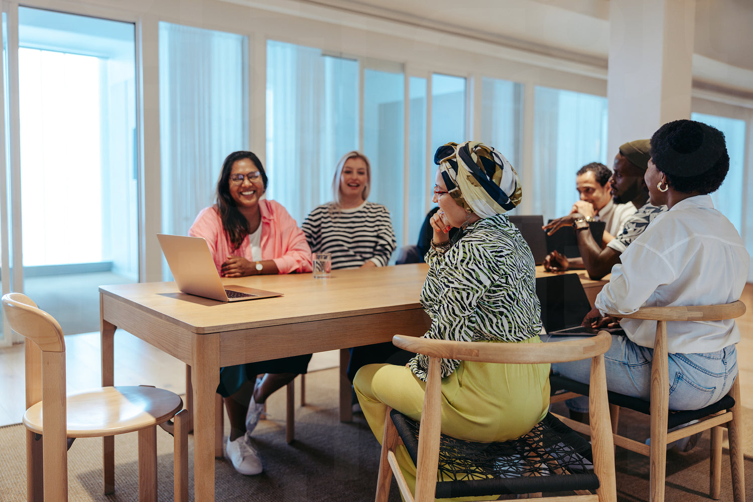 A diverse group of professionals engaged in a virtual meeting with a client. Participants are using laptops and smiling, indicating a positive and productive atmosphere.