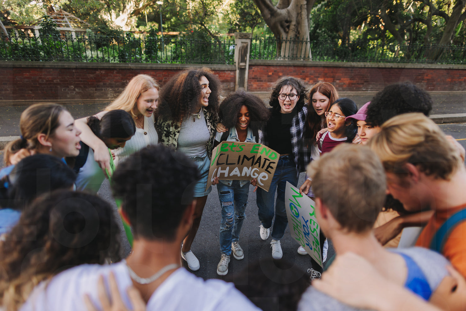 Diverse teenage activists standing up against climate change. Group of multiethnic youth activists standing together in a circle at a climate protest. Generation Z joining the global climate strike.