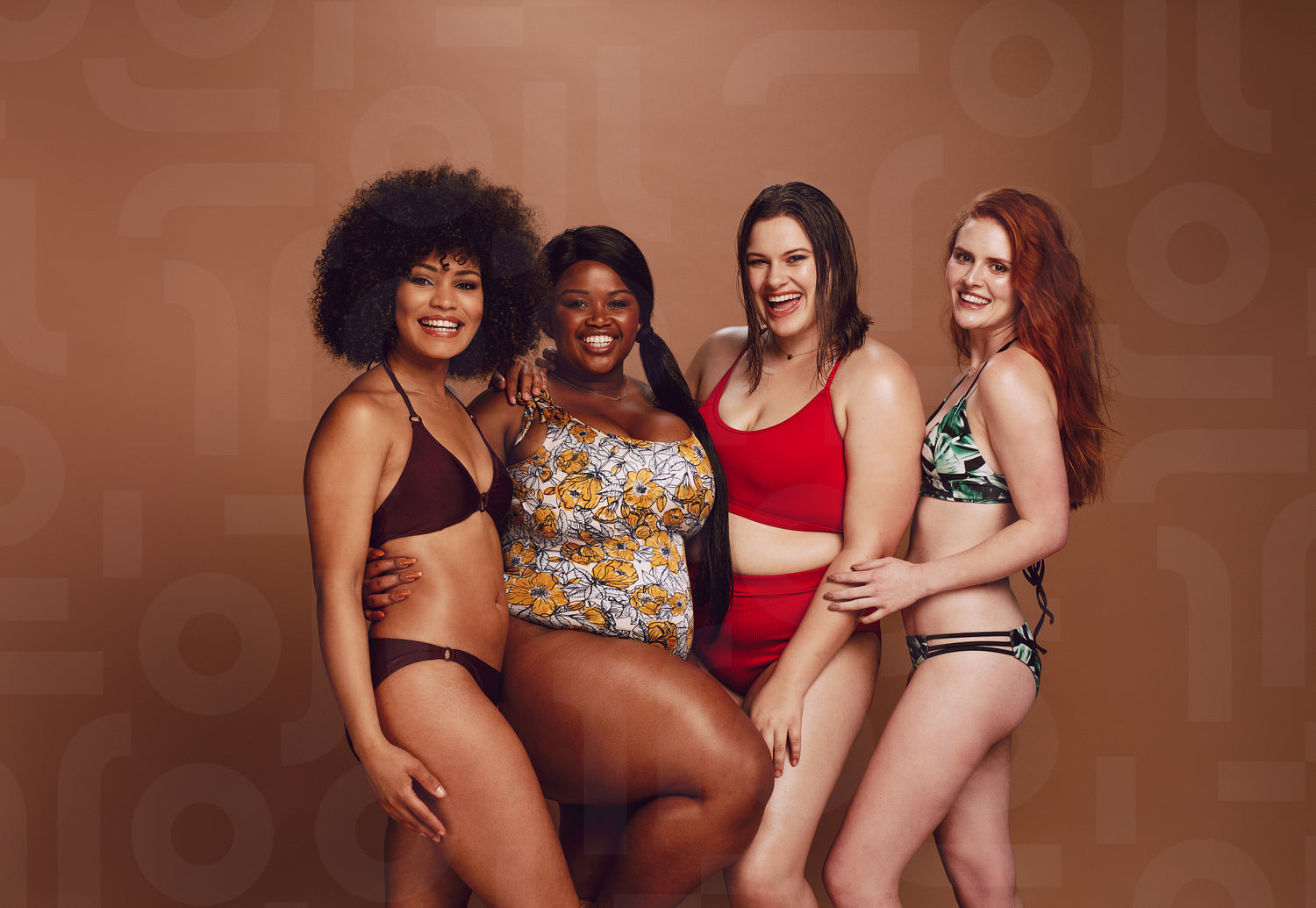 Group of women of different sizes wearing stylish bikinis and standing together against brown background. Diverse women in swimwear looking at camera and smiling.