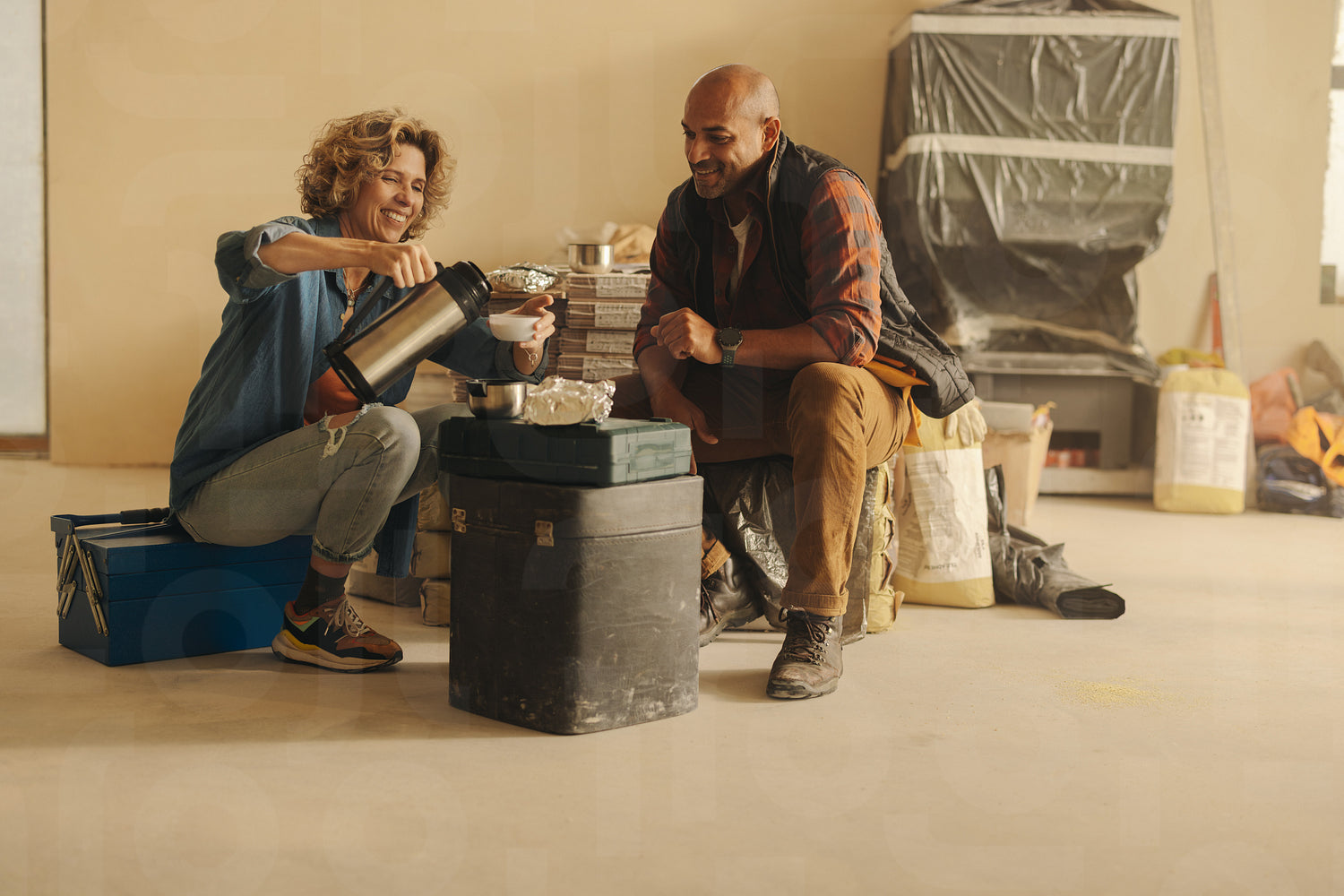 DIY couple takes a break during a home renovation project. They sit together, smiling, and enjoy a flask of coffee. Working as a team, the husband and wife find joy in their DIY remodel, pouring fuel into their remodeling efforts.