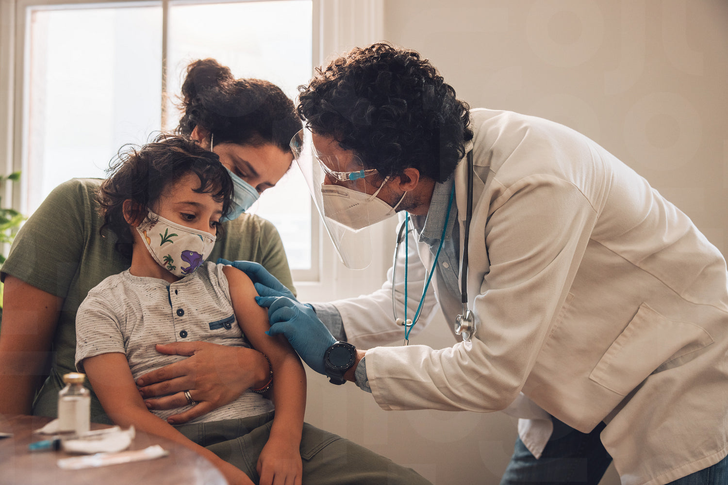 Doctor giving vaccine to a small boy with mother at home