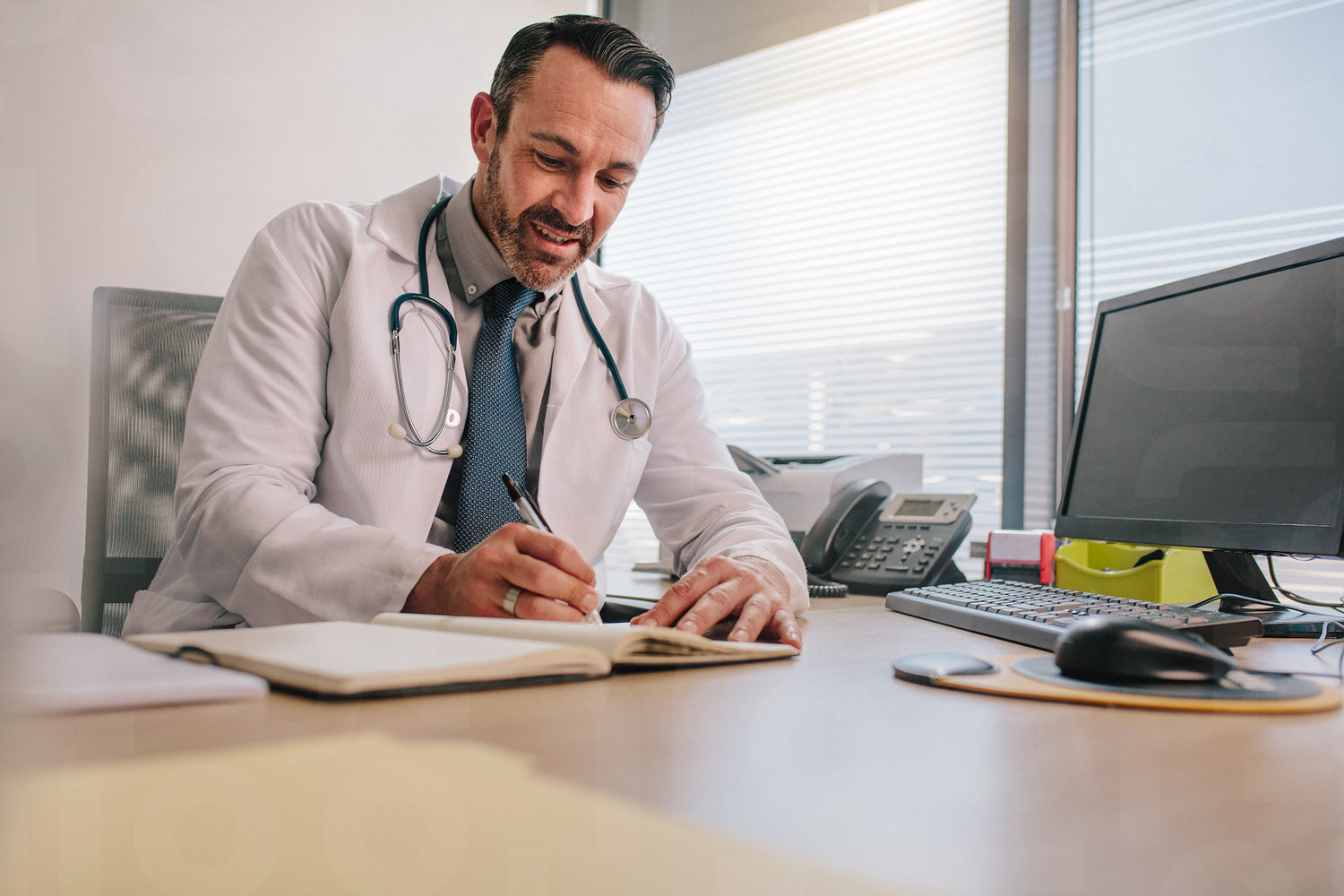 Doctor writing in his diary sitting at clinic desk