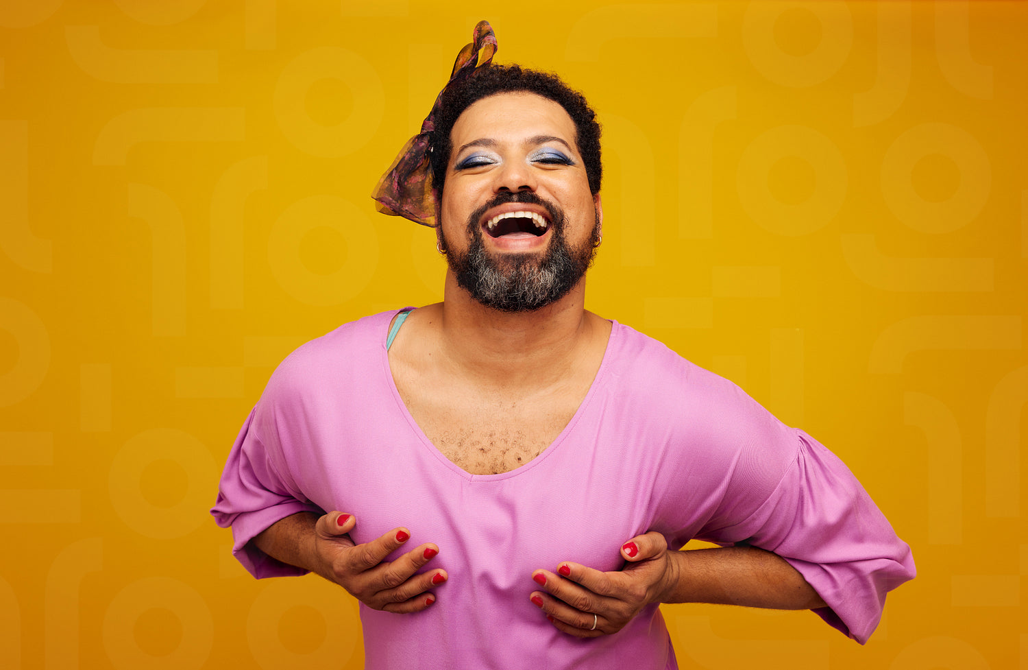 Genderqueer posing on yellow background. Drag queen in female outfit looking at camera.