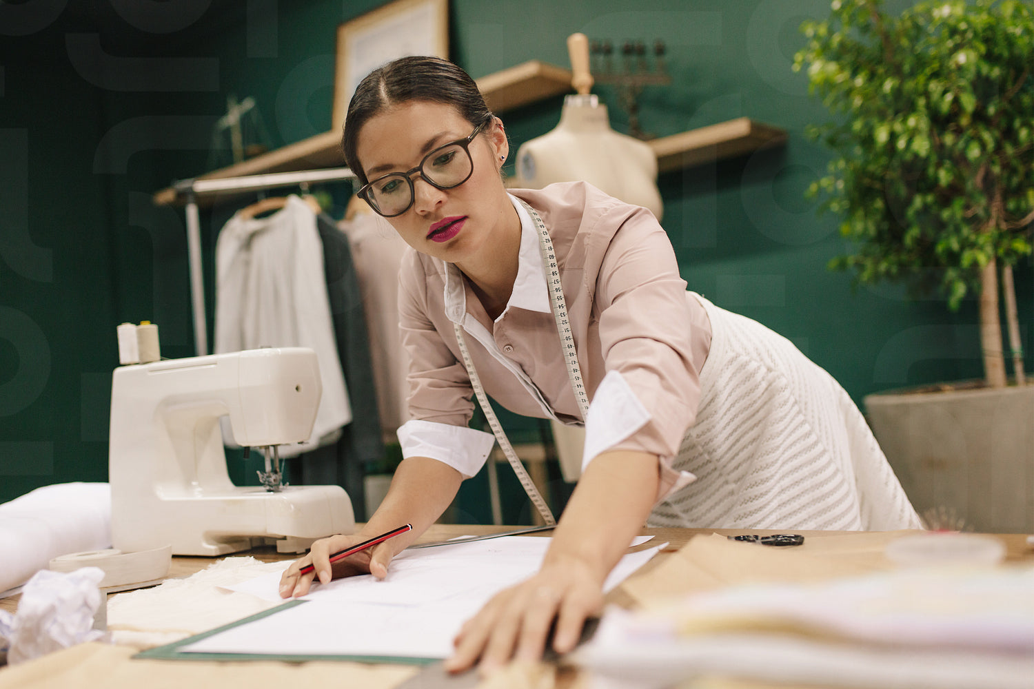 Dressmaker designing clothes pattern on paper