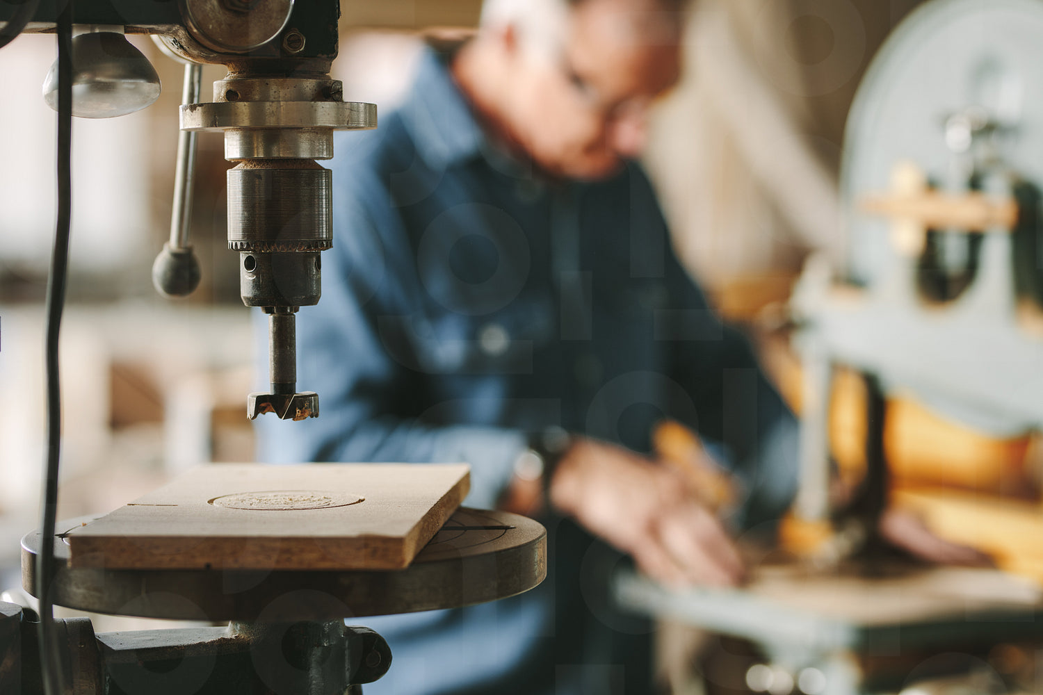 Drilling machine in carpentry workshop with senior carpenter working on band saw in background.