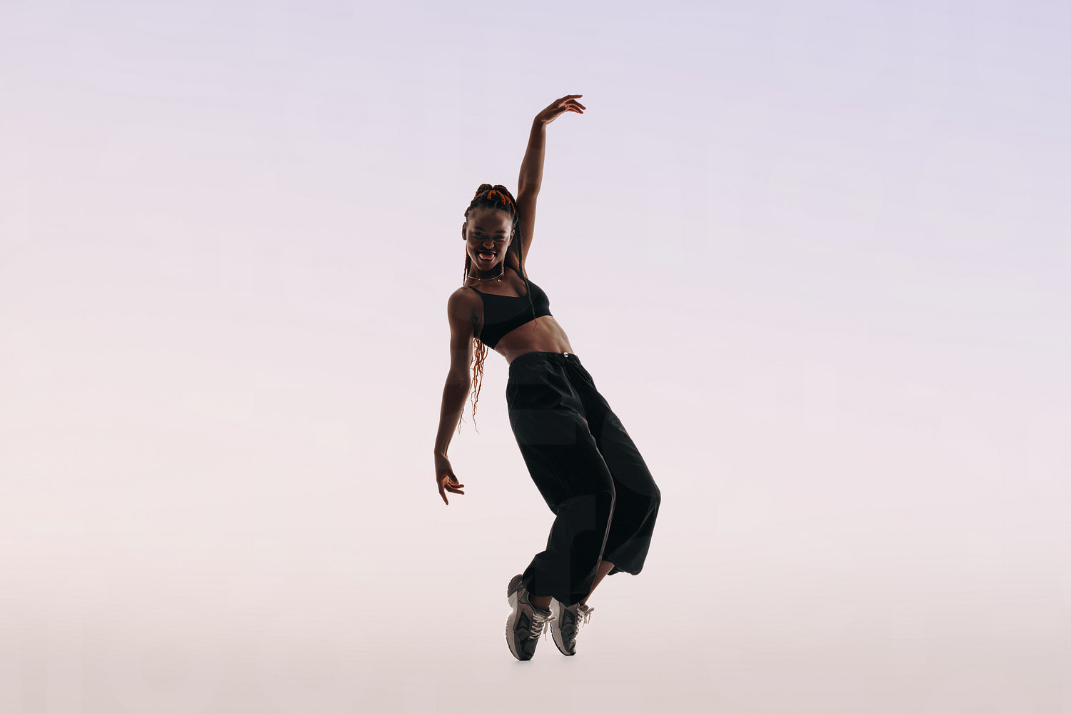 Expressive female dancer with confident posture and toned physique celebrates with dynamic moves in a studio. Fit and flexible, she embodies Gen Z's active lifestyle wearing pants and a sports bra. Full length shot.