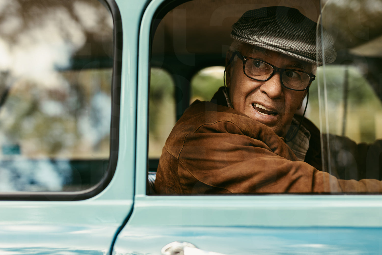 Senior man looking out of window while driving car. Elderly man wearing cap and eyeglasses driving a vintage car.