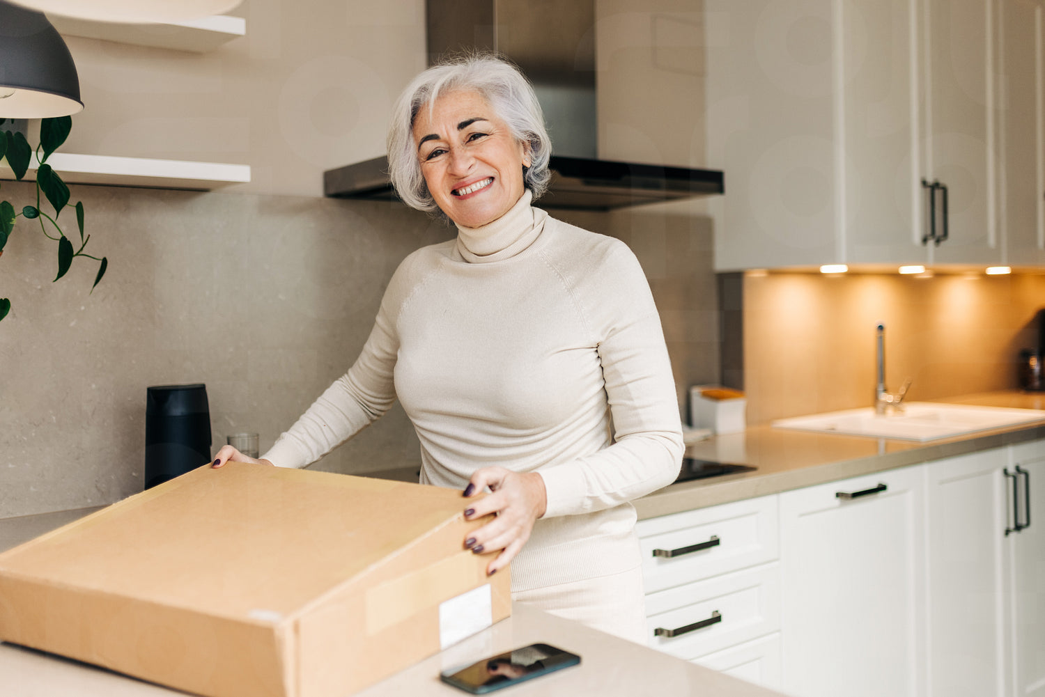 Happy elderly woman unpacking a delivery box at home. Cheerful online shopper smiling at the camera while opening a her package.