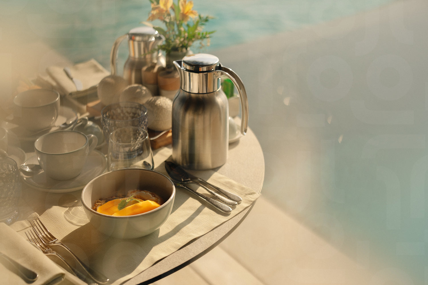 Breakfast set featuring coffee, fruit, and flowers arranged on a table by the poolside in a villa, capturing a relaxing morning ambiance.