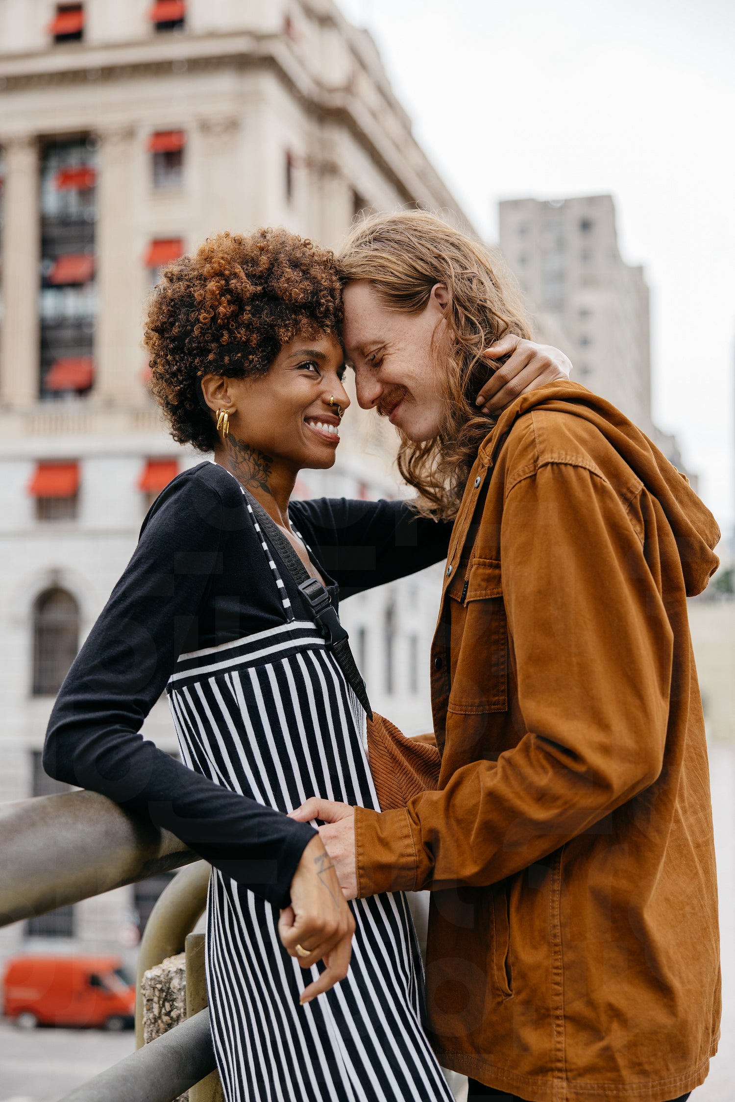 A tender moment between a young couple, lovingly wrapped in an embrace on a city street, sharing a connection amidst the urban backdrop.