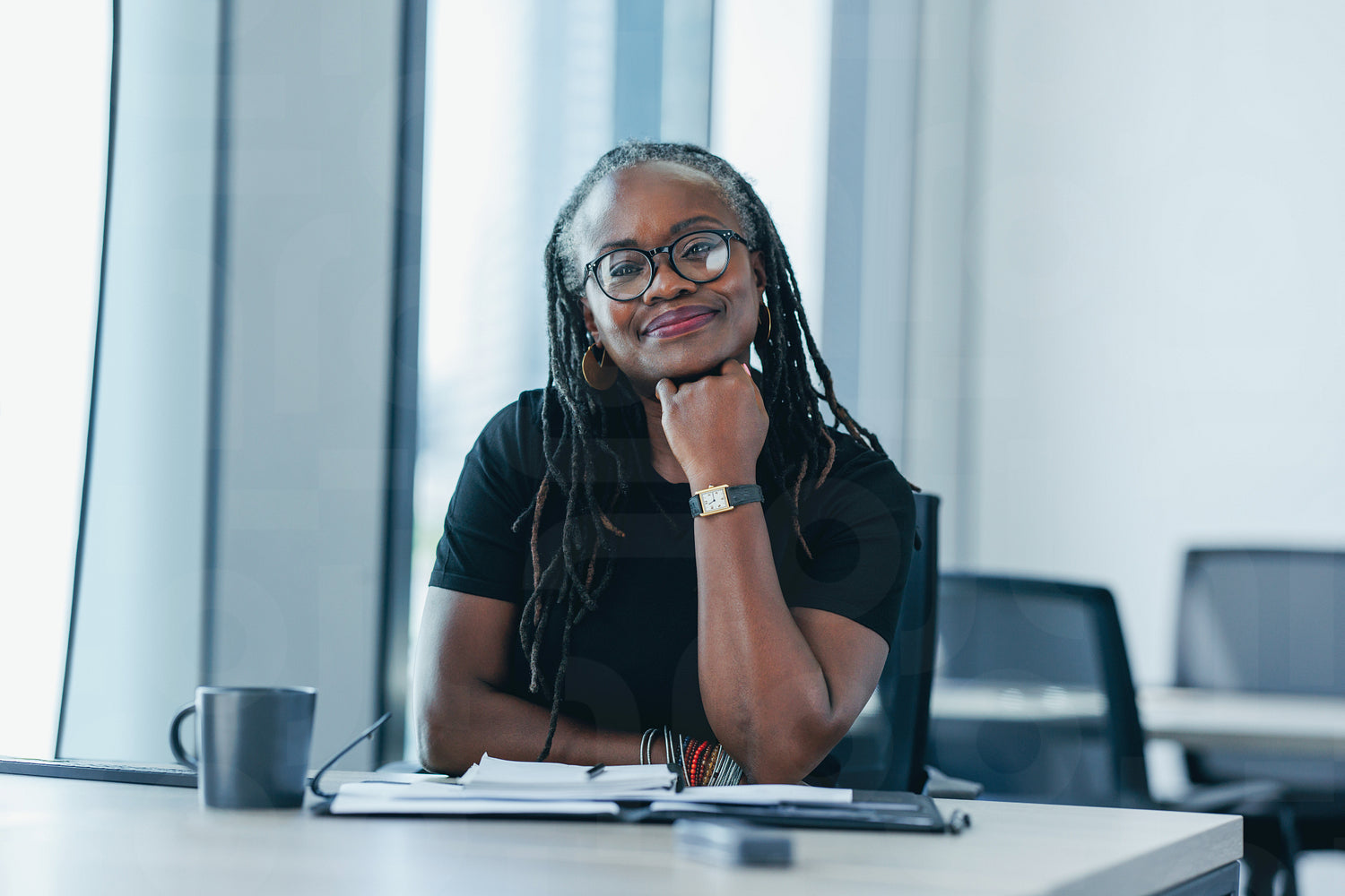 Empowered black business woman looking at the camera with confidence while sitting at her desk. Mature professional expressing self-assurance in her expertise and abilities in a business office.
