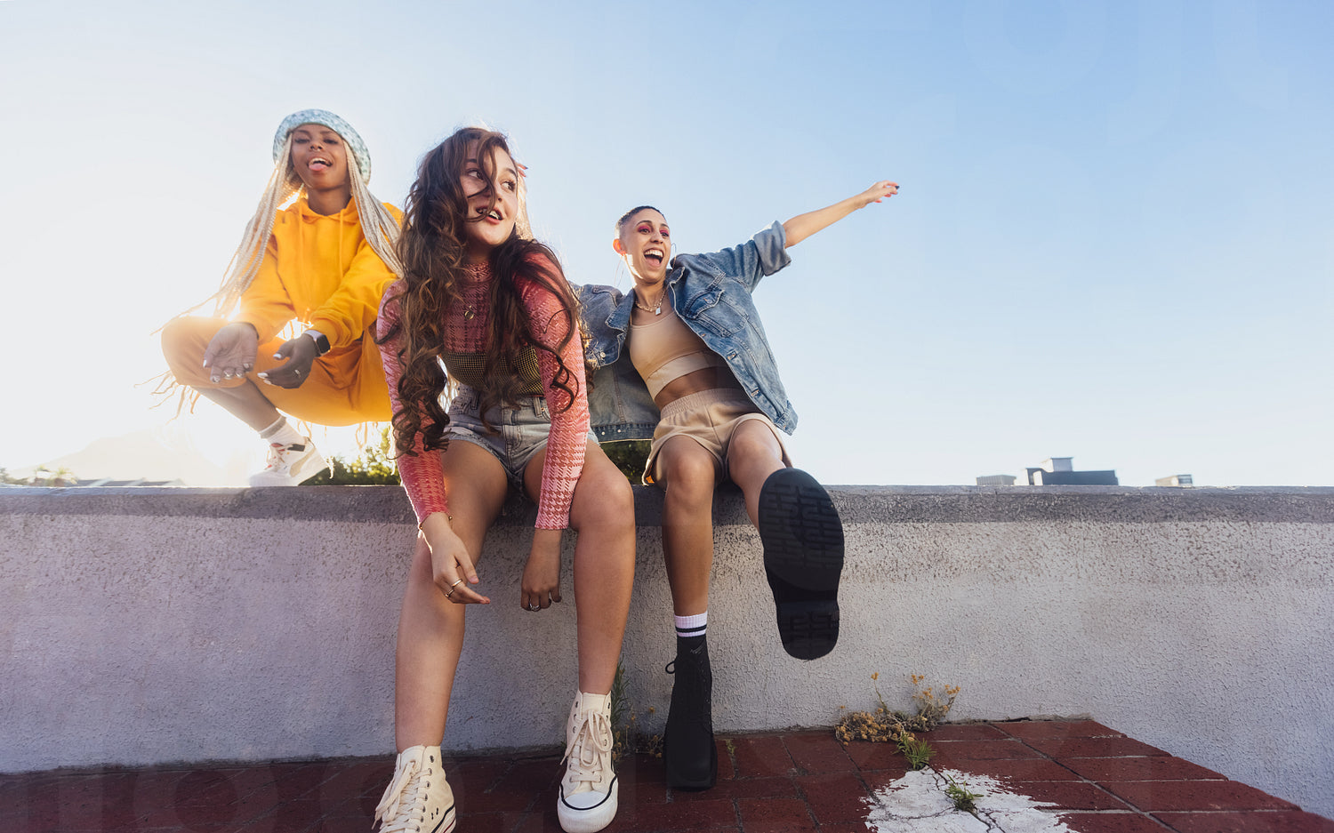 Energetic female friends enjoying themselves outdoors. Three happy friends smiling while hanging out on a wall in the city. Cheerful female youngsters having fun together.