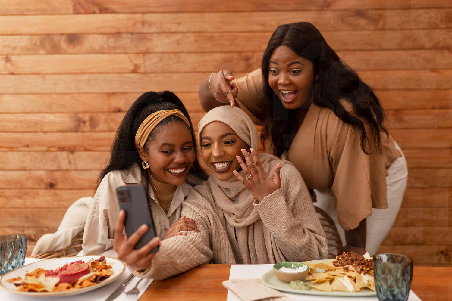 Engaged muslim woman showing off her ring on a video call. Group of three multicultural young women celebrating an engagement in a restaurant. Cheerful female friends having lunch together.