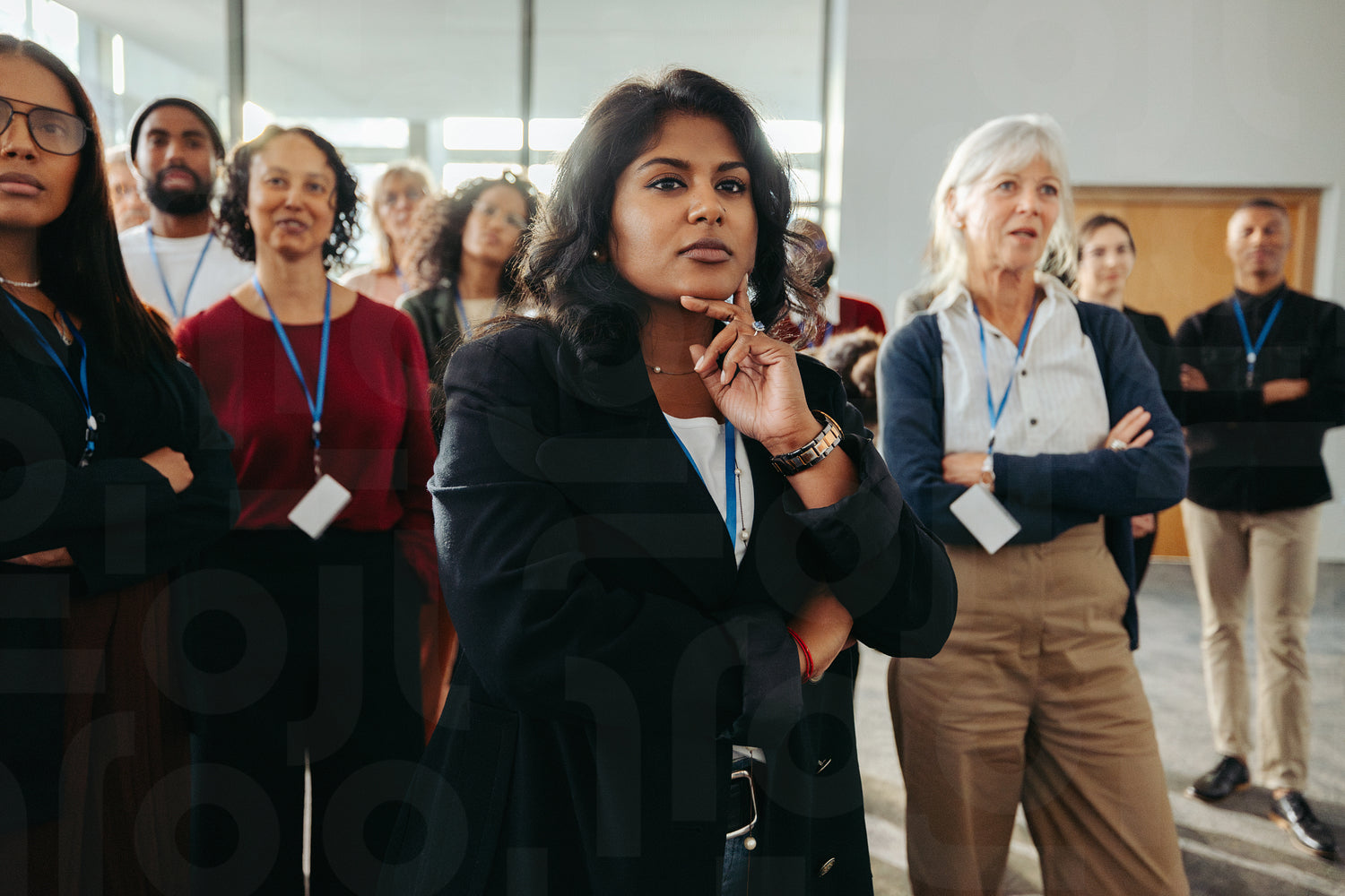 A diverse team listens intently to an engaging business speech, fostering collaboration and inspiration in a dynamic workplace setting.