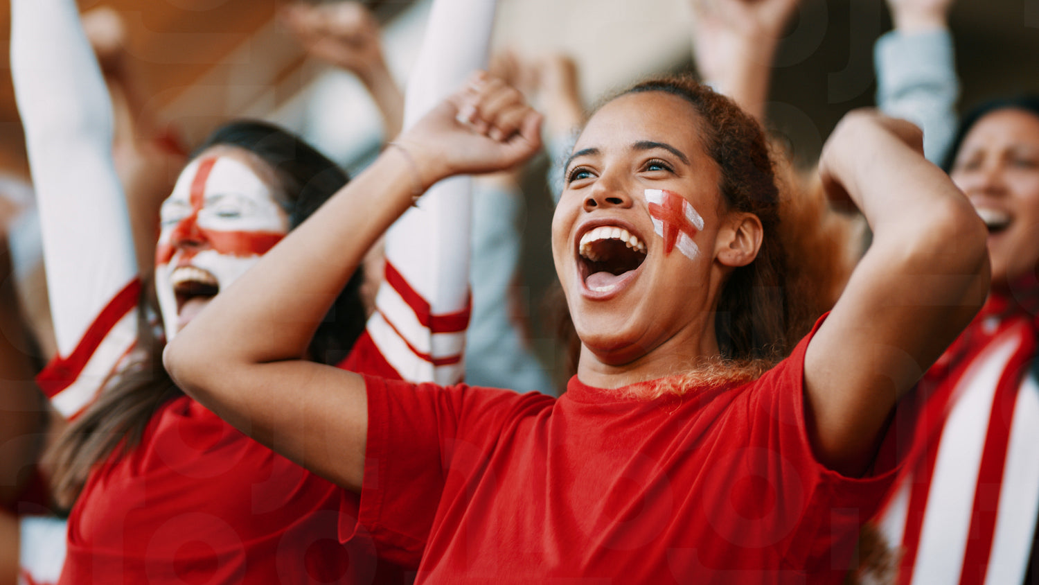 Female soccer fans of England watching and celebrating their team's victory. English female spectators enjoying after a win at stadium.