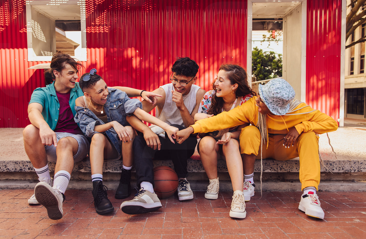 Enjoying a good time with friends in the city. Group of multiethnic young people hanging out together outdoors. Cheerful generation z friends having fun and making happy memories.