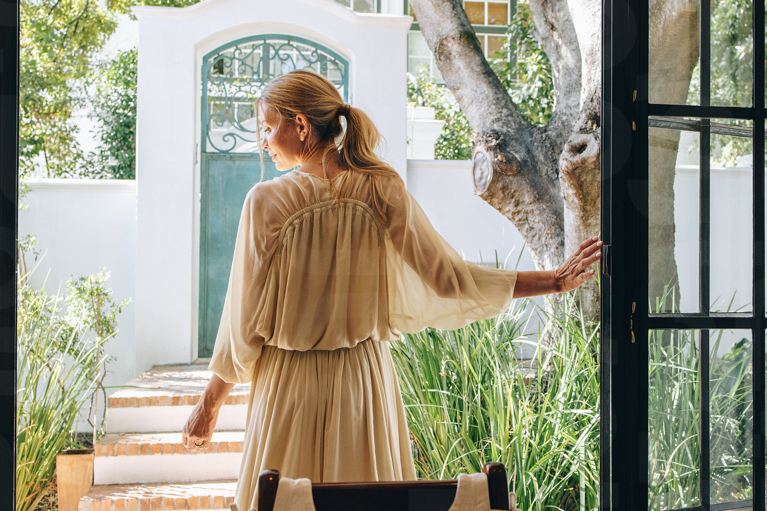 Enjoying a sunny afternoon at a hotel. Rearview of a carefree tourist woman standing at the door of a luxury hotel in a stylish dress. Attractive woman enjoying her summer vacation alone.