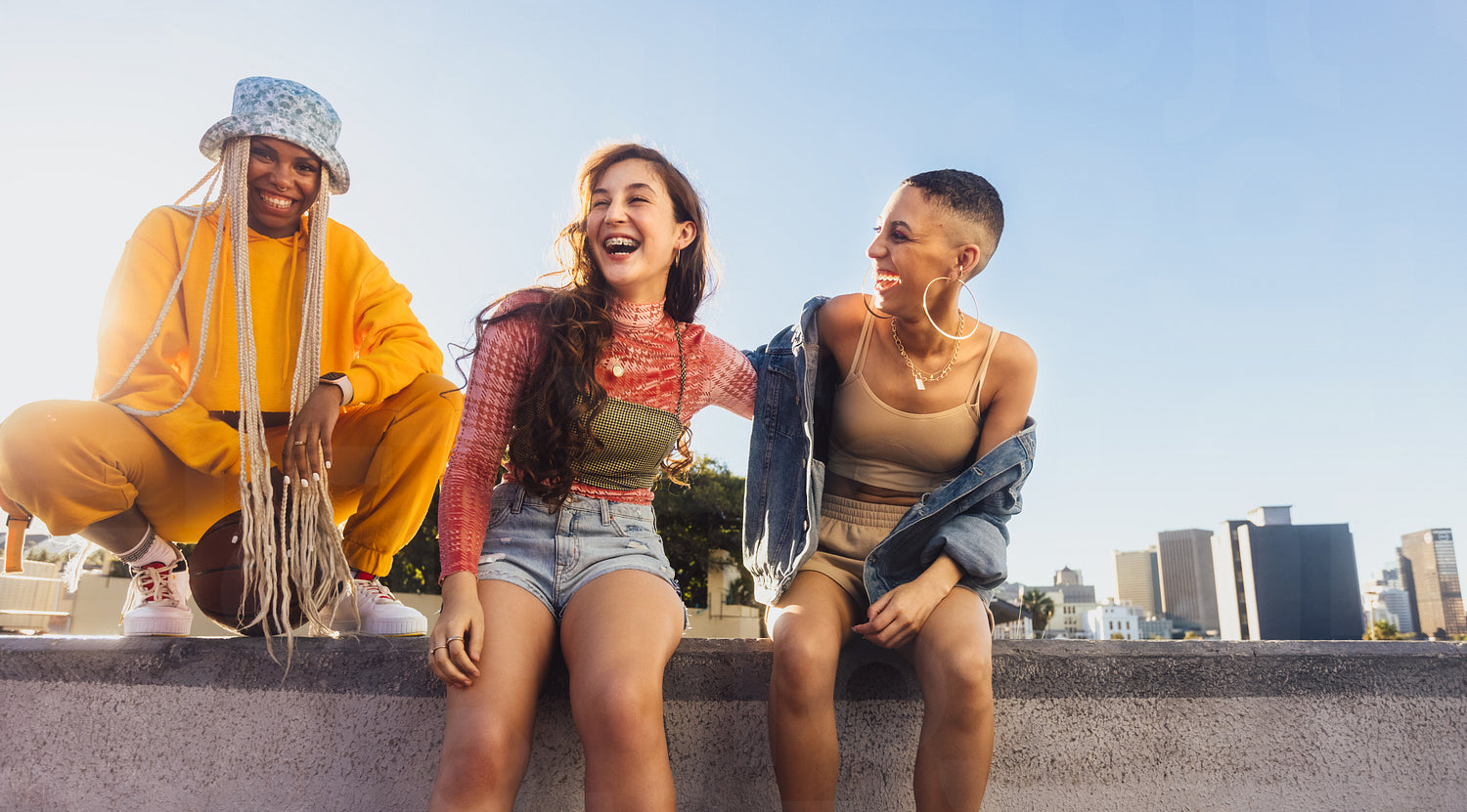 Enjoying girl time in the city. Three carefree female friends laughing cheerfully while sitting together on a wall. Multiethnic youngsters having fun and making happy memories.