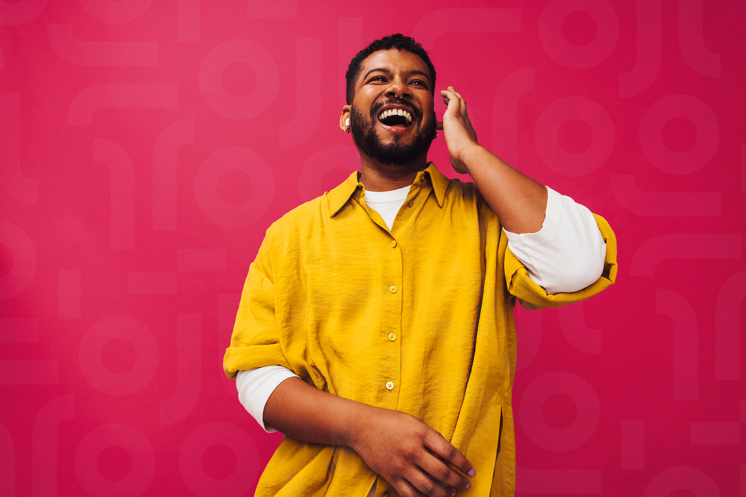 Enjoying my favourite playlist. Happy young man smiling cheerfully while listening to music using wireless earphones in a studio. Carefree young man standing alone against a pink background.