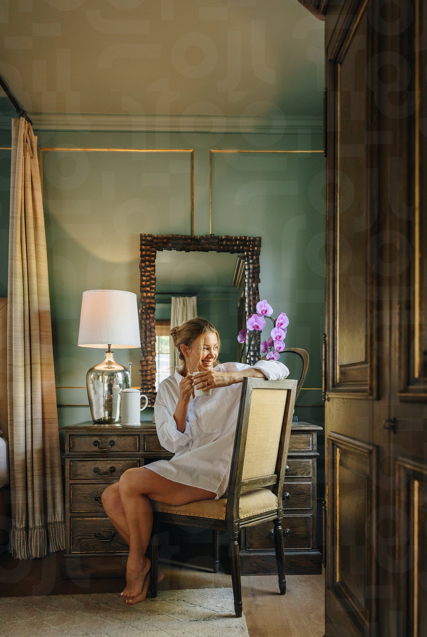 Enjoying the view outdoors. Attractive young woman looking outdoors with a smile on her face while sitting on a chair and holding a cup of coffee. Young woman enjoying her holiday in a luxury hotel.