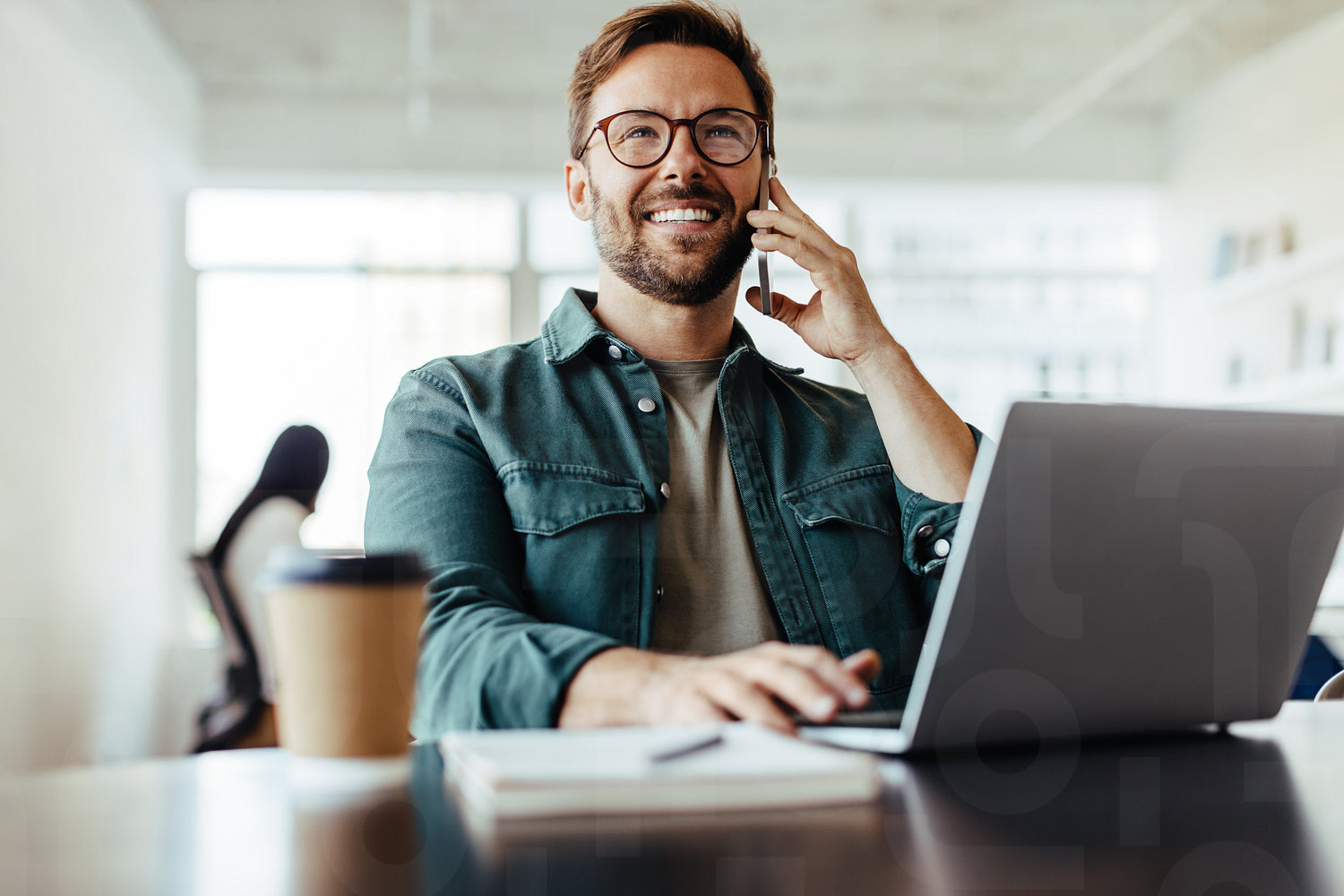 Entrepreneur making a phone call while working on a laptop. Young business man making plans with a client in an office.