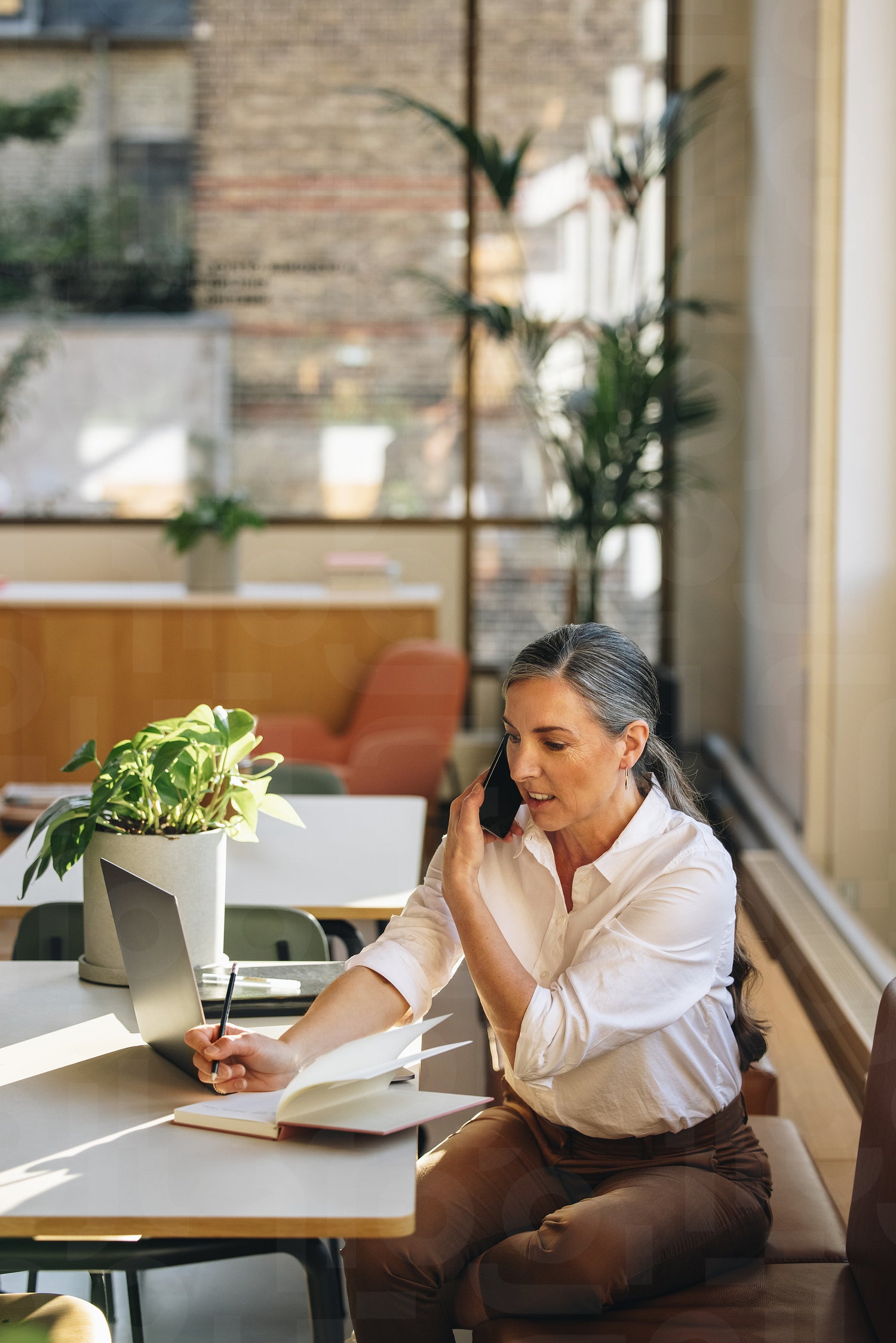 Entrepreneur talking on cell phone in office