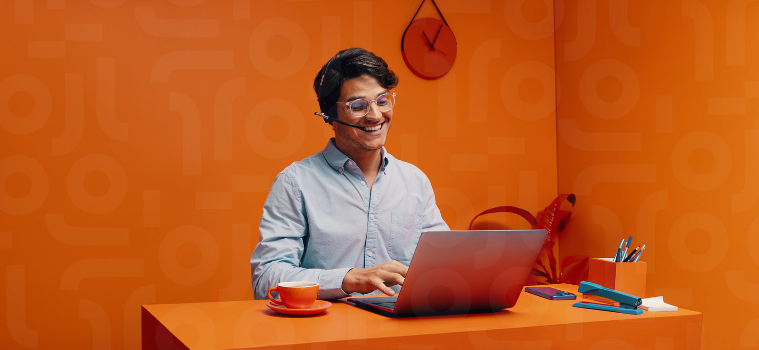 A cheerful entrepreneur is sitting at a desk wearing a headset in a vibrant orange office, happily typing on a laptop in a vibrant monochromatic set.