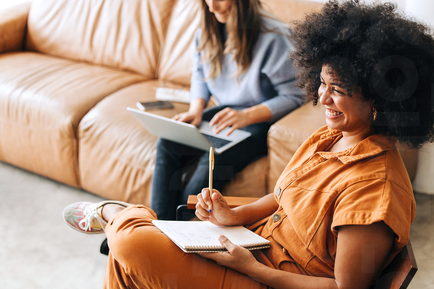 Ethnic businesswoman smiling happily while sitting with a notebook in an office lobby. Cheerful young businesswoman working in an office with her colleague.