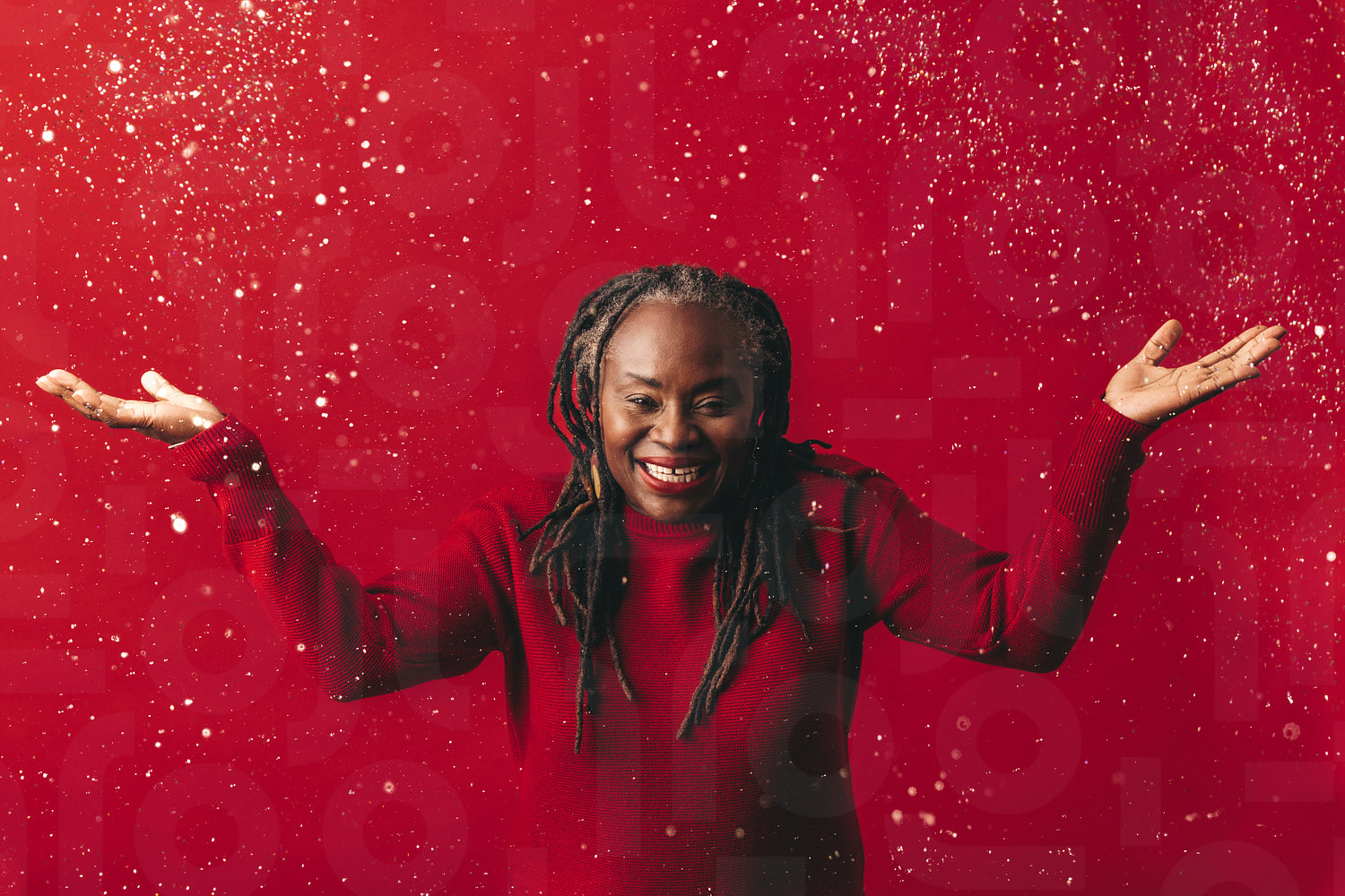 Excited woman with dreadlocks smiling at the camera while standing under falling confetti. Happy mature woman celebrating life while standing against a red background.