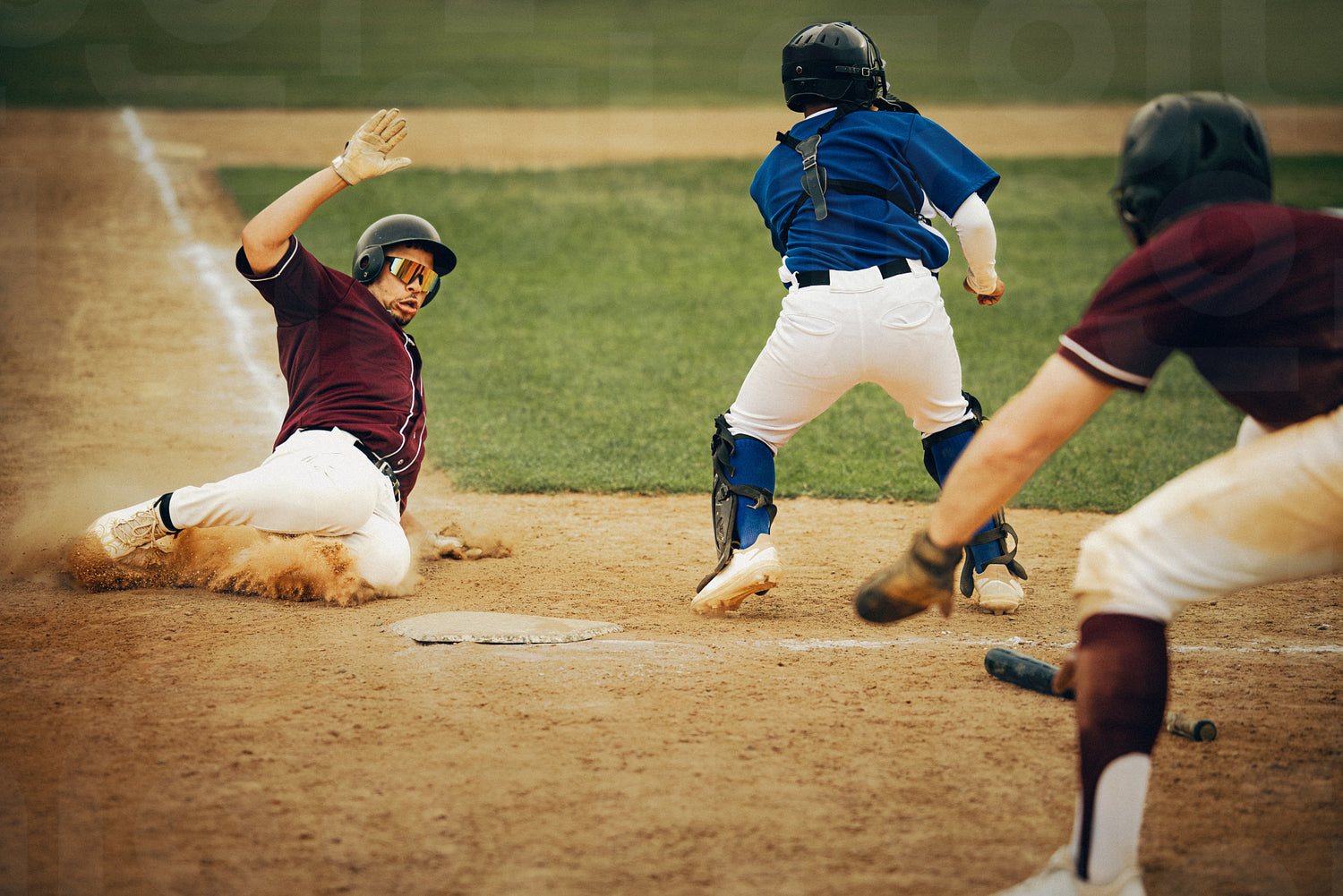 Dynamic action shot from a baseball game featuring a dramatic slide into home base, with dust flying and the catcher ready to tag. This photo has intentional use of 35mm film grain.