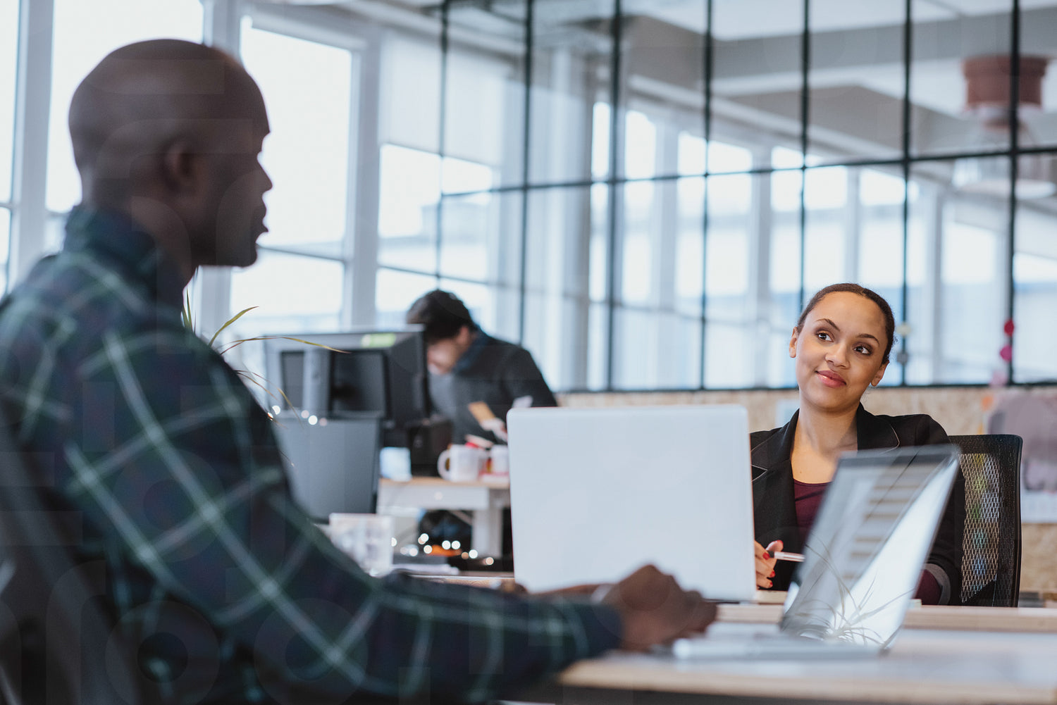 Young woman looking at male colleague while sitting at a table with laptop. African executive discussing work with coworker.