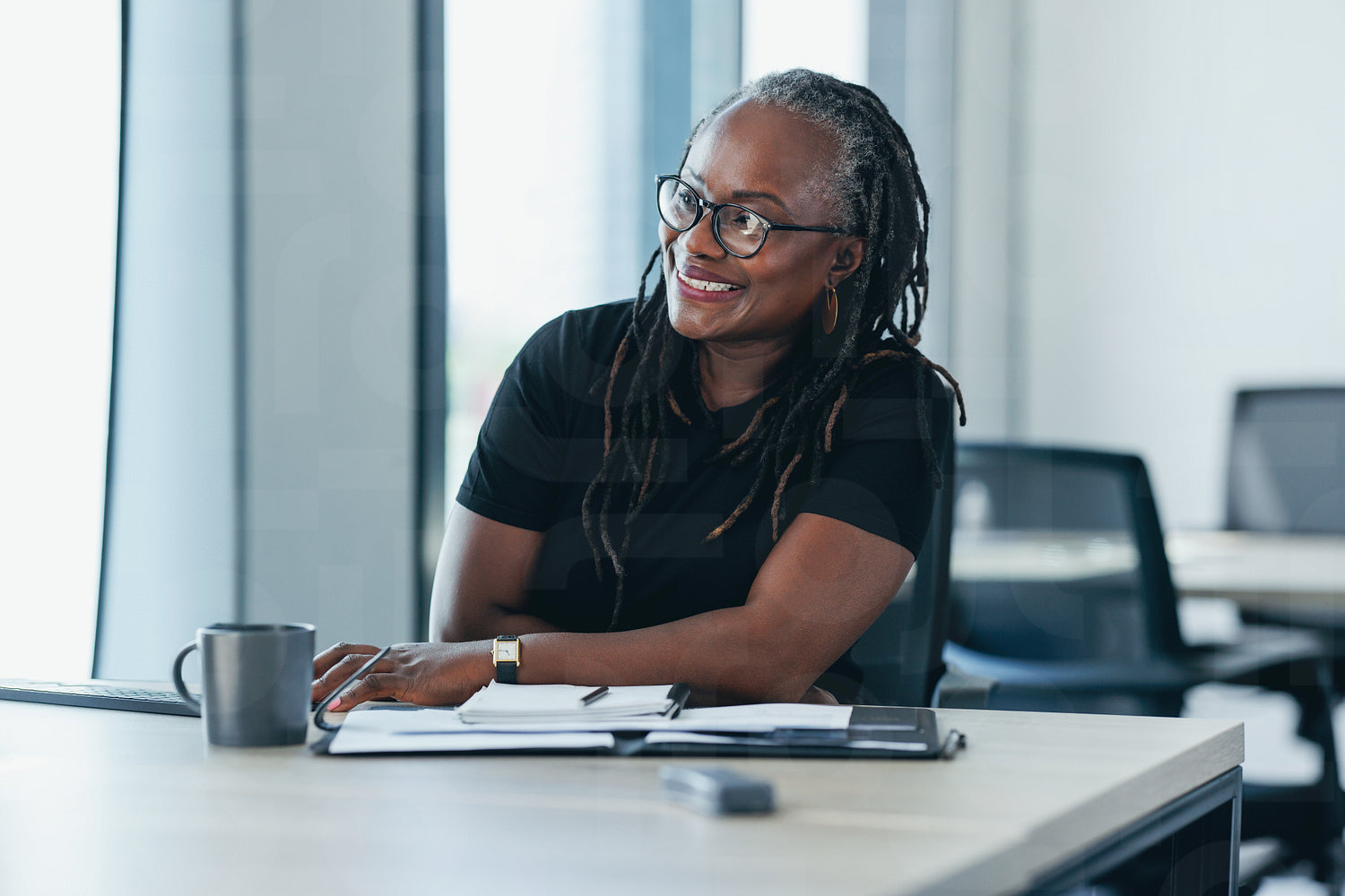 Experienced black business woman smiling and looking at her computer screen as she works on a task. Mature female professional using her expertise to achieve success in a business office.