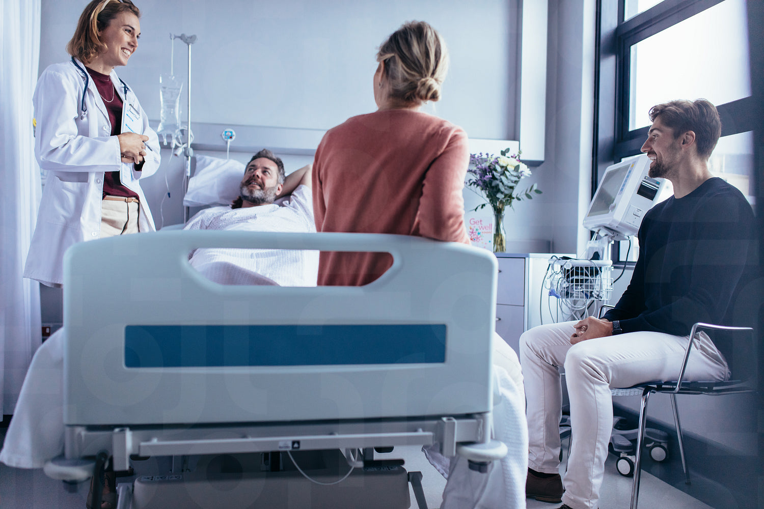 Family and friends visiting patient and talking with doctor