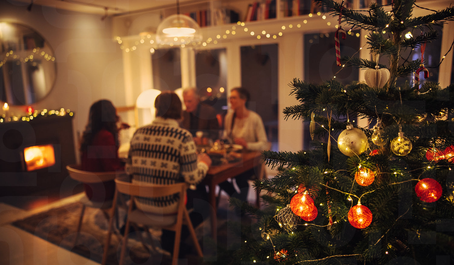 Interior shot of warm cozy Christmas decorated family home. Family sitting at dinner table having a Christmas eve dinner together.
