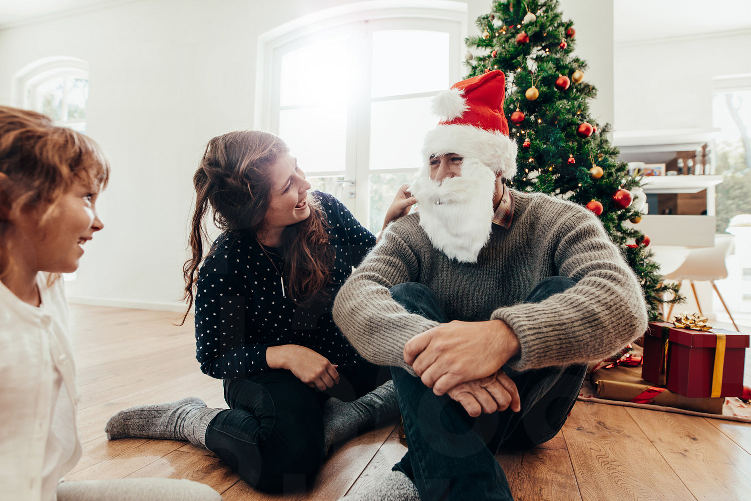 Family celebrating Christmas at home with Christmas tree and gifts. Woman and child watching man with Santa cap and beard.
