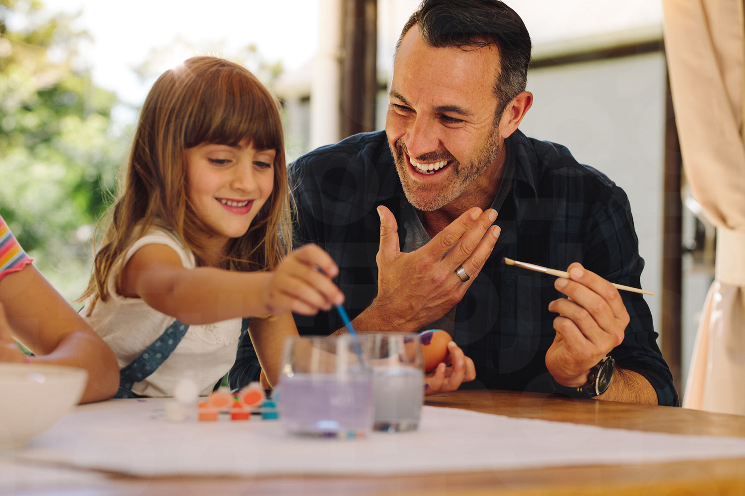 Father and daughter painting easter eggs together. Smiling man helping his daughter paint easter eggs.