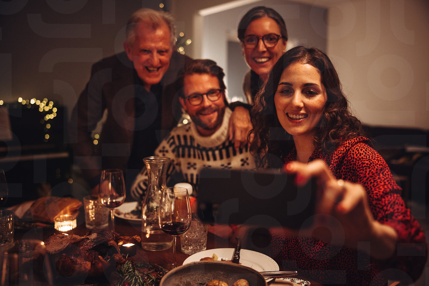 Female taking selfies with family on christmas eve dinner. Family taking selfie during Christmas dinner at home.