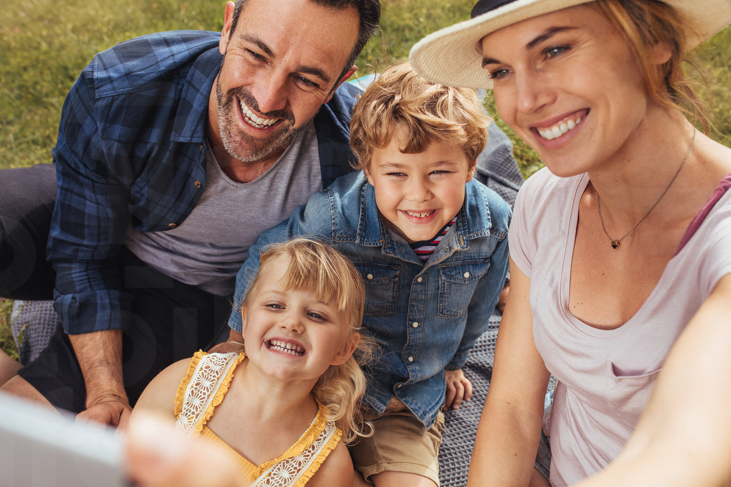 Beautiful woman with family on picnic talking selfie at park. Couple with their two children making a self portrait at park.