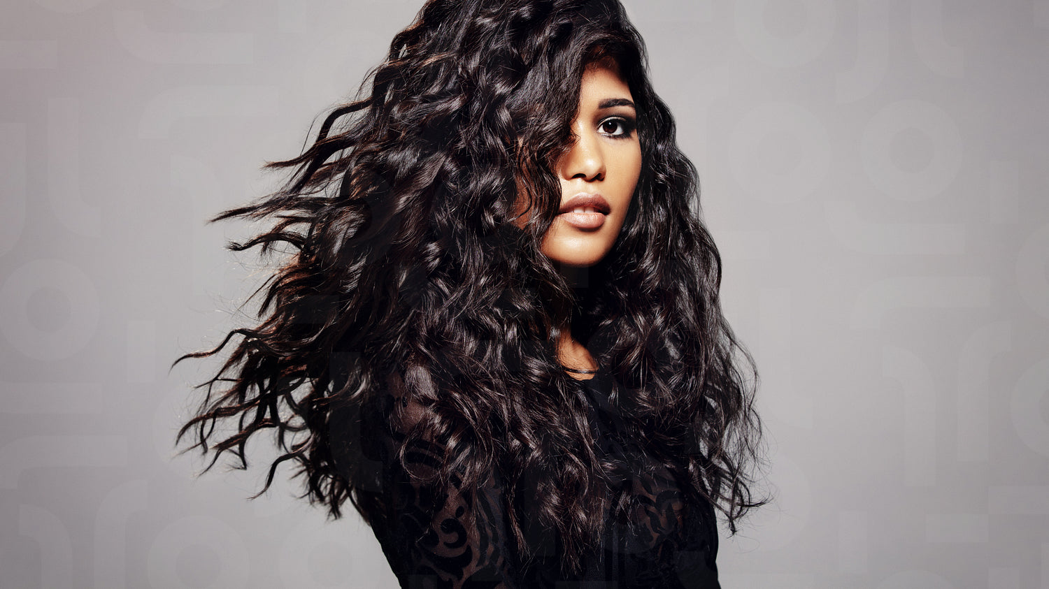 Beautiful brunette woman with long curly hair. Female fashion model with wavy hairstyle against grey background.