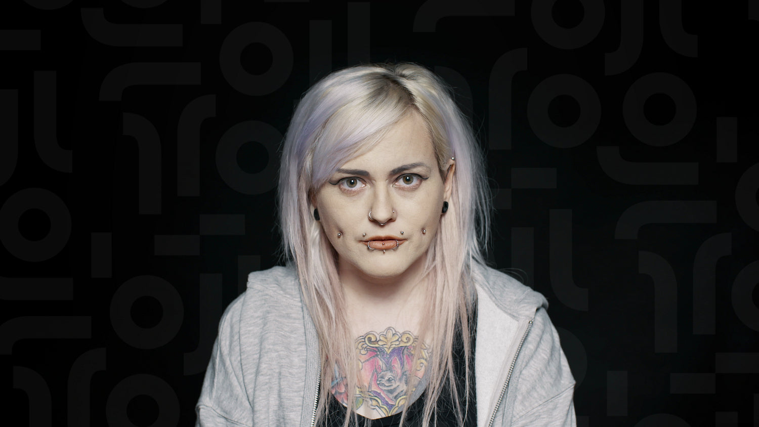 Woman with fashion piercing on lips and cheeks on black background. Female with white hair and tattoo on body looking at camera.