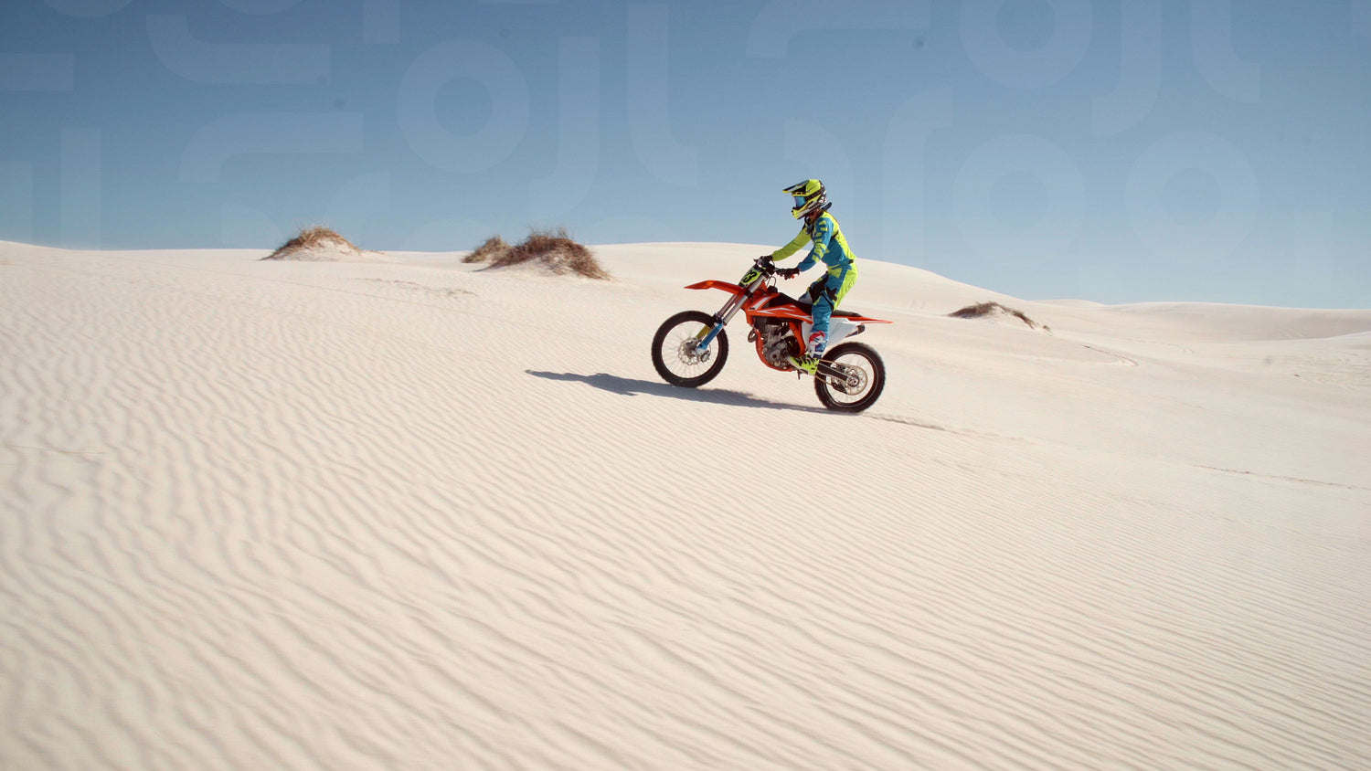 Fast motorcyclist jumping obstacles while riding over sand dunes. Young motocross racer speeding on an off-road motorbike in a desert.