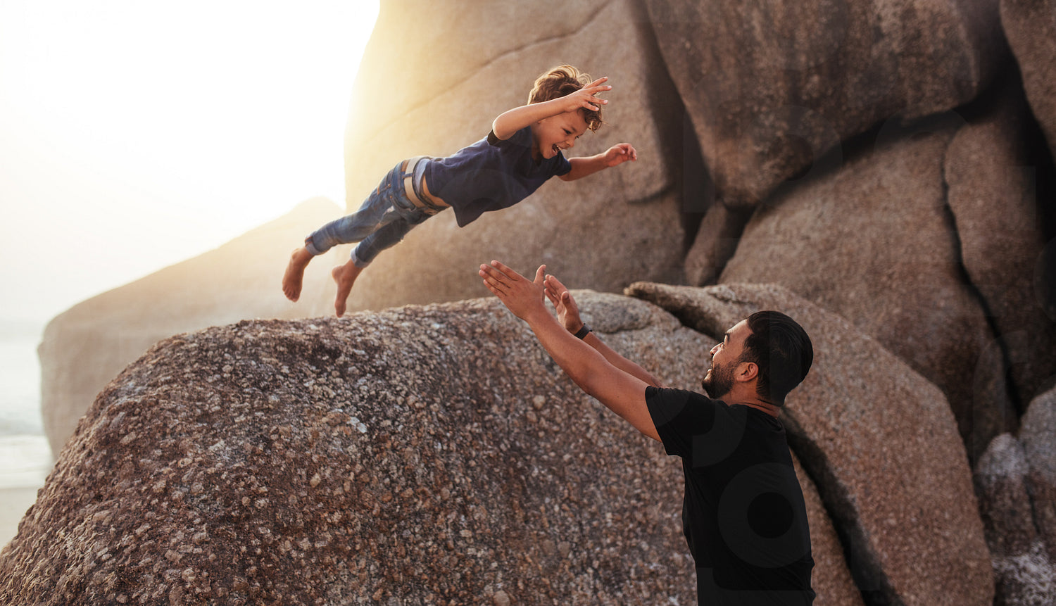 Shot of cute little boy leaping into his fathers arms from a big rock. Father and son enjoying summer holidays at the beach.