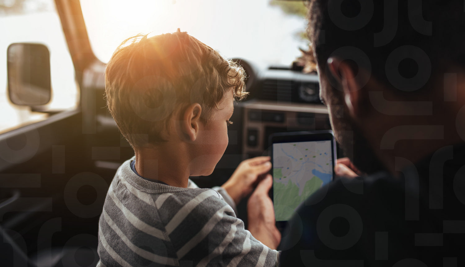 Rear view shot of father and son sitting in the car and planning the route of a road trip using digital tablet. Man with little boy using navigation app on digital tablet.