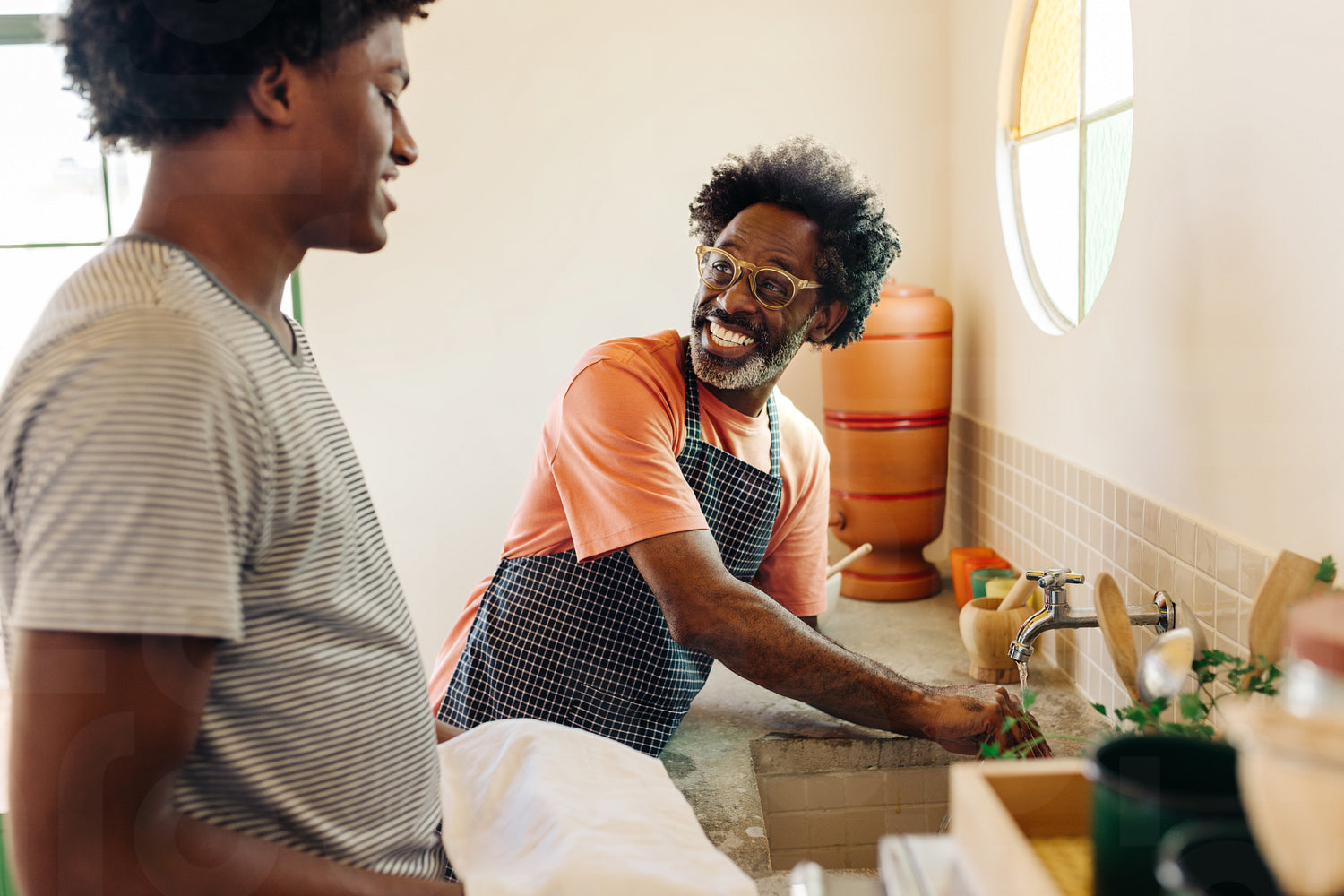 Mature father and his teenage son wash their hands at the sink in a Brazilian kitchen, using a clay filter for clean water. Happy family promoting cleanliness and hygiene in their home.