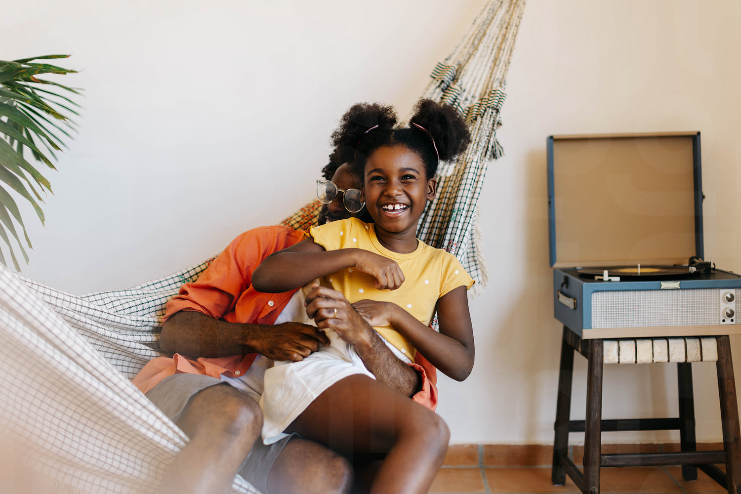 Cheerful black family enjoying relaxation time in a hammock at home. Black father and daughter laughing and smiling, having fun together and cherishing their happy parent-child relationship.