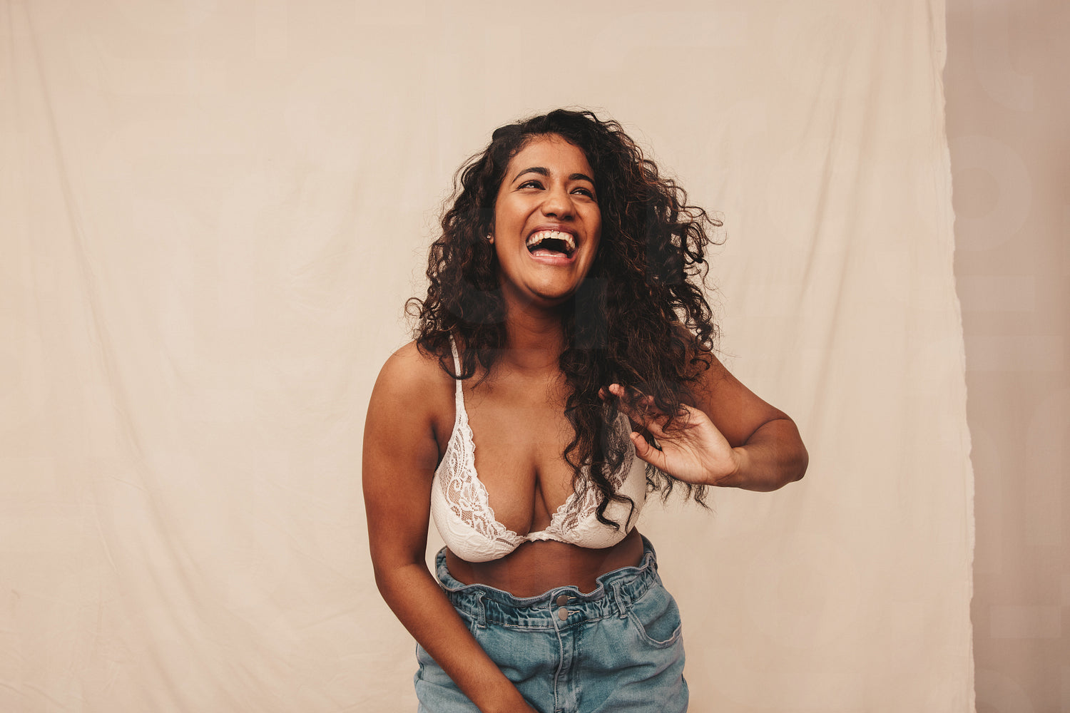 Feeling cheerful in the studio. Happy young woman laughing while standing against a studio background. Body positive young woman feeling comfortable in denim jeans and a bra.