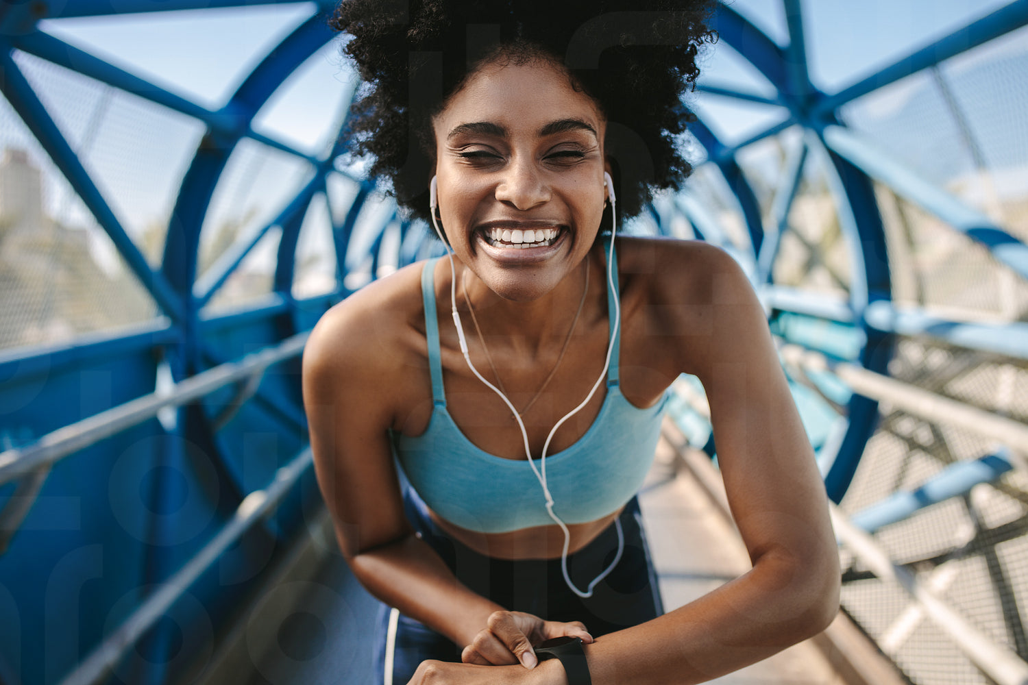 Young fitness woman with smart watch looking at camera and smiling. Sportswoman setting up her smart watch before a run.