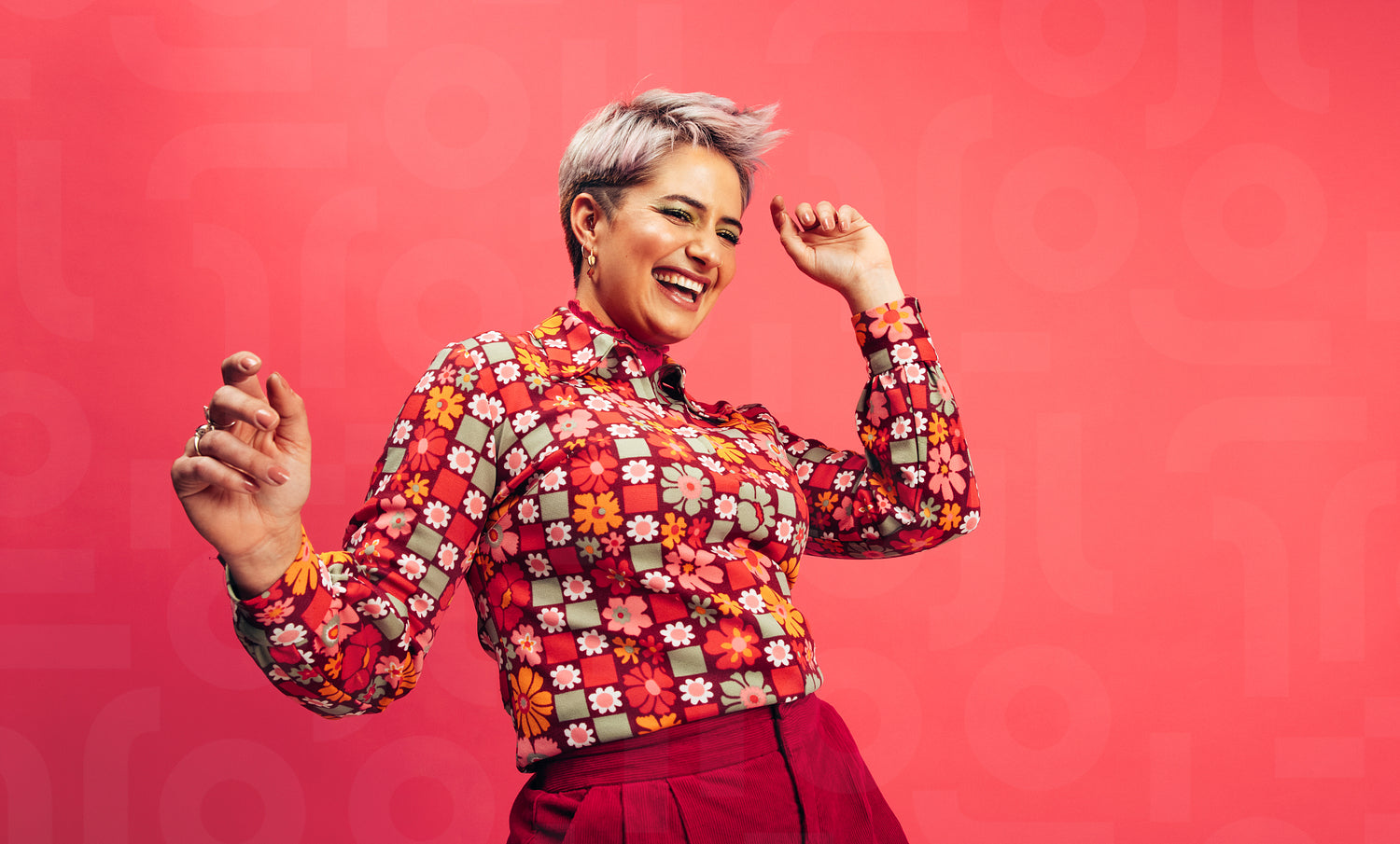 Feeling vibrant and energetic. Happy young woman dancing and smiling cheerfully while standing against a red background. Young woman with dyed hair having fun in the studio.